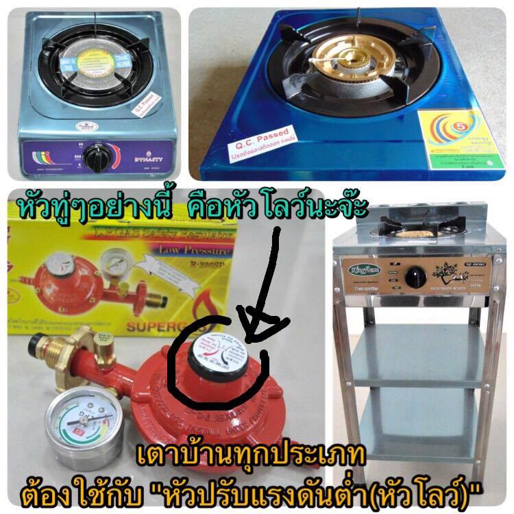 ตอบ เตาบ้านทุกประเภท จะใช้กับหัวปรับแรงดันต่ำ (ดังรูปซ้าย) เตาเร่ง เตาแม่ค้าทุกประเภท จะใช้กับหัวปรับแรงดันสูง (ดังรูปขวา)